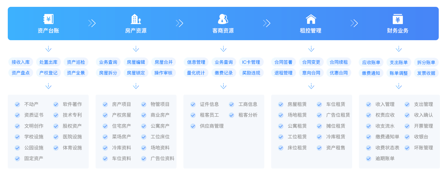 面向智慧园区、多业态商业地产、商场商业运营、国有资产、物业管理和租赁管理等场景,提供全流程资产管理方案